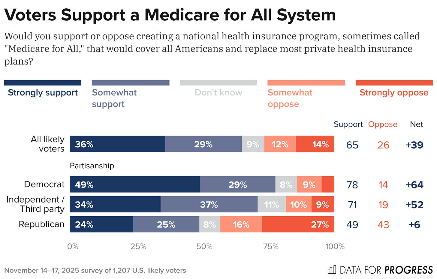 MEDICARE FOR ALL: Via Data for Progress, VERBATIM: “In a new survey, Data for Progress finds that 65% of voters support a Medicare for All system — described as a ‘national health insurance program…that would cover all Americans and replace most private health insurance plans.’ This includes majorities of Democrats (78%) and Independents (71%), and a plurality of Republicans (49%).”