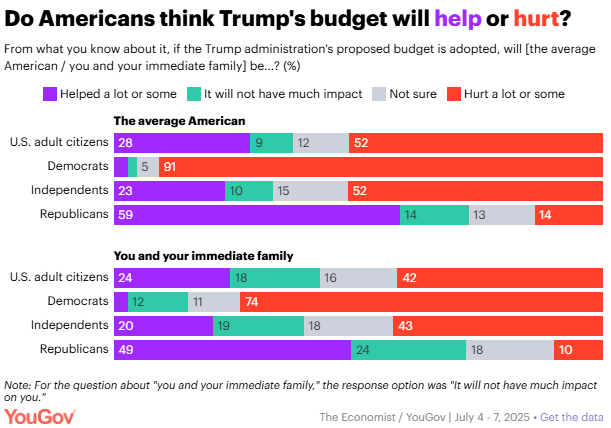 POLL: Via YouGov, VERBATIM: “53% of Americans strongly or somewhat oppose Trump's budget, which was signed into effect earlier this week; 35% support it. Opposition to the budget has risen 10 percentage points since we first asked about it in April of this year. Just after Trump's budget was passed during his first term in 2017, it was opposed by a slightly smaller margin — 41% to 28% — than the margin against his current budget.”