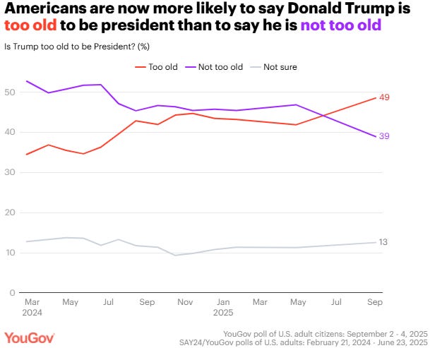TRUMP: Via YouGov, VERBATIM: “Americans are more likely to say that Trump is too old to be president than to say he is not too old (49% vs. 39%).”