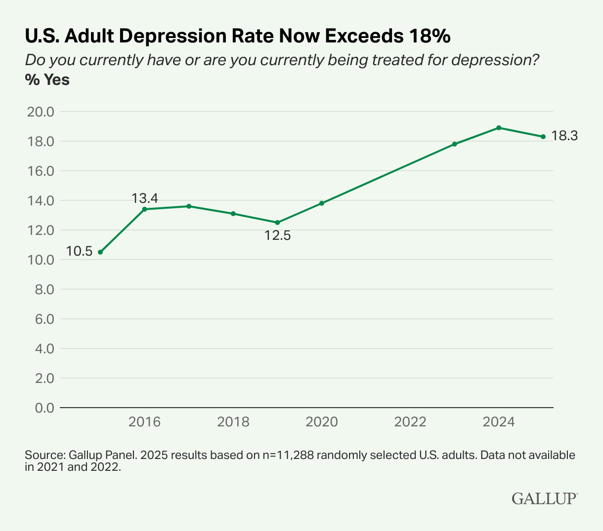DEPRESSION: Via Gallup, VERBATIM: “The percentage of U.S. adults who report currently having or being treated for depression has exceeded 18% in both 2024 and 2025, up about eight percentage points since the initial measurement in 2015. The current rate of 18.3% measured so far in 2025 projects to an estimated 47.8 million Americans suffering from depression. Most of the increase has occurred since the onset of the COVID-19 pandemic in 2020.”