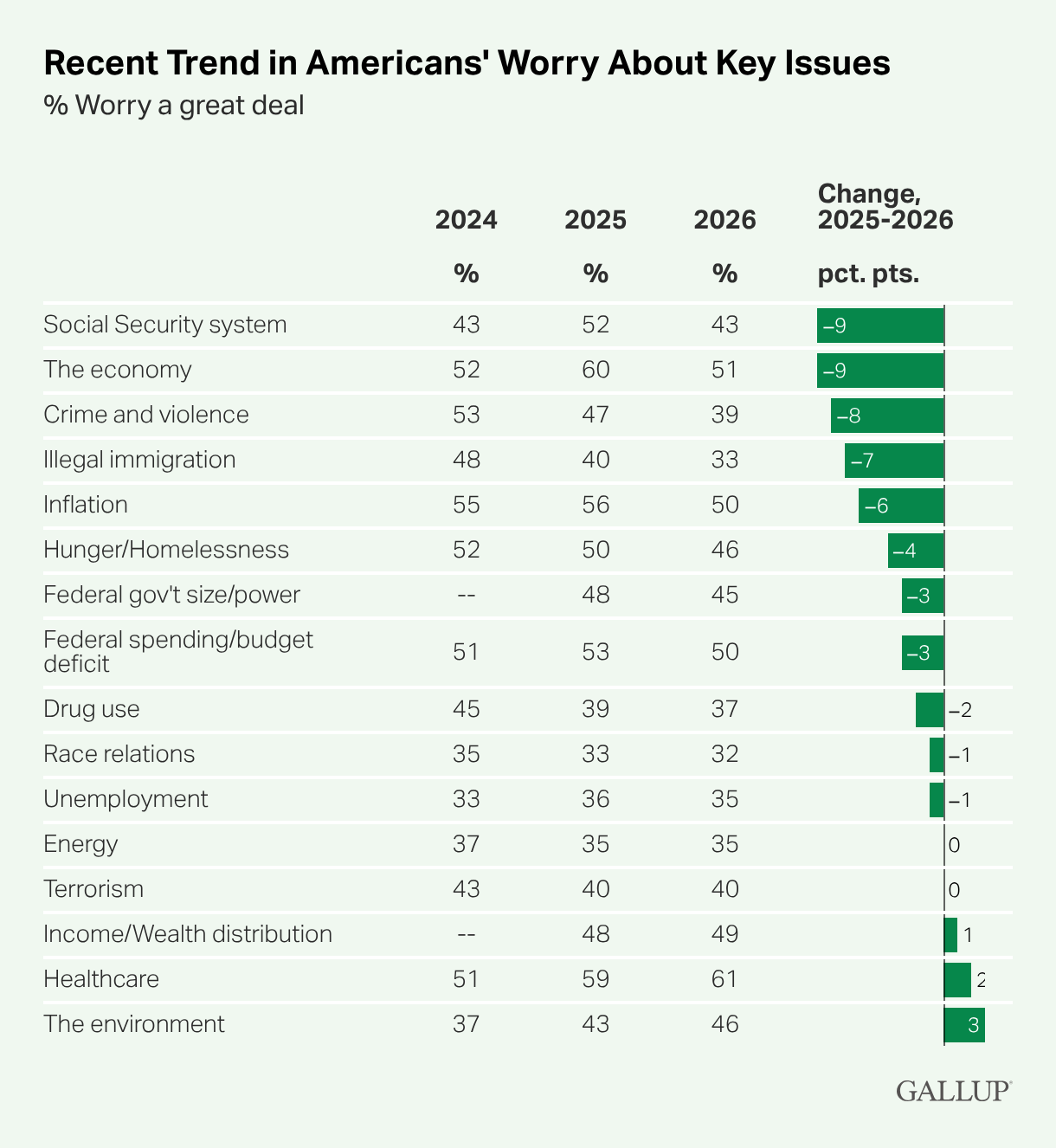 DOMESTIC WORRIES: Via Gallup, VERBATIM: “As the Iran war intensified in March, the latest Gallup poll found healthcare topping Americans’ list of domestic concerns, with more saying they worry ‘a great deal’ about it (61%) than about 15 other domestic policy areas. This was followed by four economic matters of high concern to about half of adults: the economy, inflation, federal spending and the budget deficit, and the way income and wealth are distributed.”