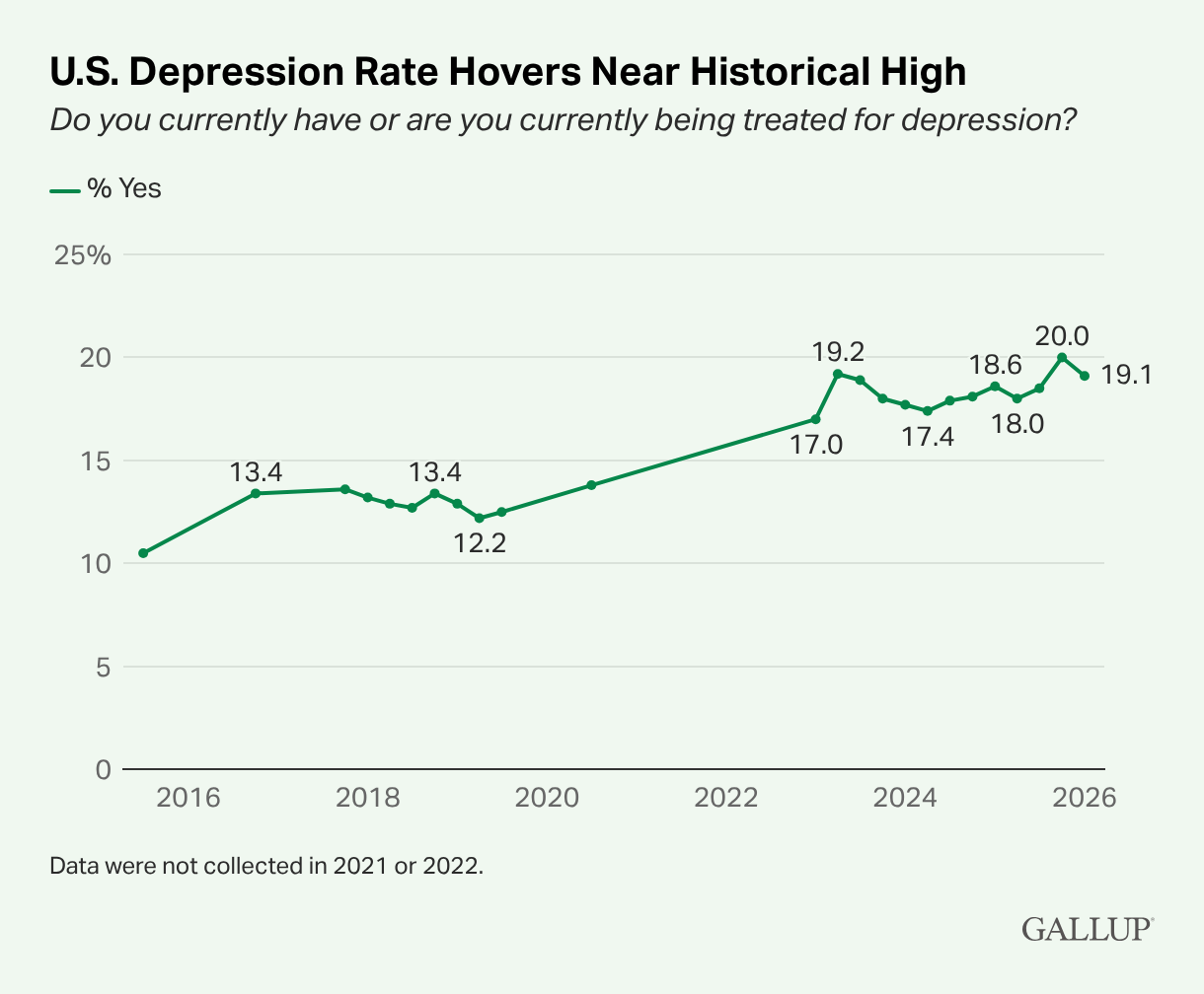 DEPRESSION: Via Gallup, VERBATIM: “The percentage of U.S. adults who report currently having or being treated for depression was 19.1% in the first quarter of 2026, similar to the high mark of 20.0% recorded the preceding quarter and up nearly nine percentage points since the initial measurement in 2015.”