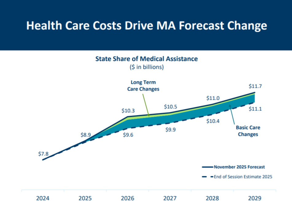 AND: “Medical Assistance (MA) expenditures increased by $1.285 billion (7.3 percent) from end ofsession estimates. This is primarily explained by higher costs for basic health care services plus higher costs and enrollment in long term care waivers.”