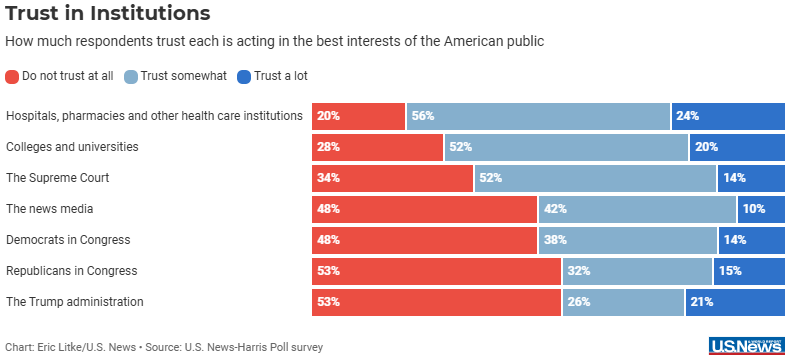 TRUST: Via U.S. News & World Report, VERBATIM: “From the White House to the courthouse, the emergency room and the classroom, Americans are losing trust in institutions – illuminating a leadership crisis across the United States, according to a new survey by U.S. News and World Report.”