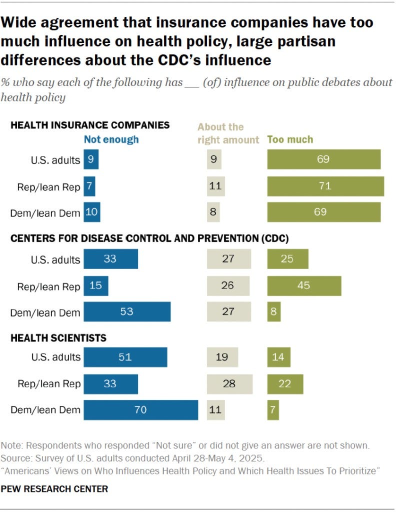 “Of the eight groups and institutions we asked about in this survey – such as Congress, the general public and federal courts – health insurance companies are the one that a majority of Americans agree has too much sway in health policy.” READ: https://fluence-media.co/40jwU3E