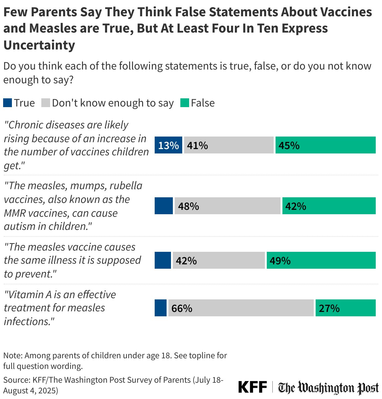 VACCINES: Via KFF, VERBATIM: “The new KFF-Washington Post Survey of Parents takes a deep dive into parents’ views and decisions related to childhood vaccines. The survey finds that while a large majority of parents report following current vaccine guidance and are confident in the safety of MMR and polio vaccines, some, including larger shares of Republican parents and younger parents, express doubts about the current childhood vaccine schedule.”