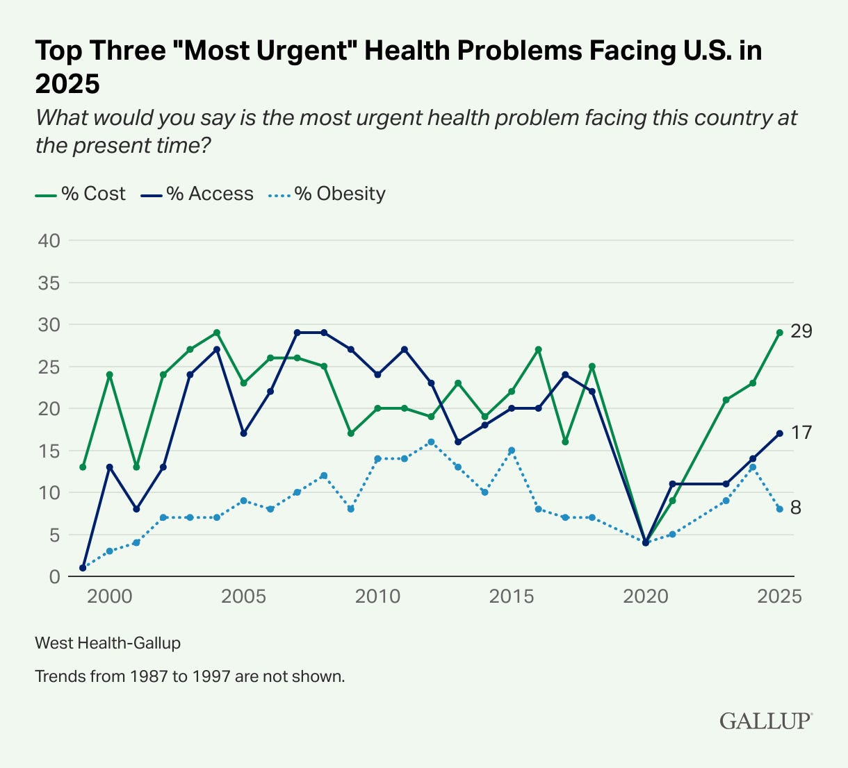 HEALTHCARE COST: Via Gallup, VERBATIM: “Americans’ already elevated perception that the cost of healthcare is the “most urgent health problem” facing the country rose further this year to 29%, up from 23% a year ago. The latest figure is the highest level recorded since 2004 and also one of the highest readings in the trend dating back to 1987.”