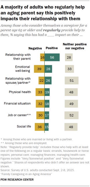 CAREGIVING: Via Pew, VERBATIM: “As the U.S. population ages, the need for caregivers among older adults is on the rise. There’s growing evidence that family members are increasingly taking on these roles . . . Among those who regularly help a parent with at least one of the tasks we asked about – errands or housework, personal care, managing finances, or managing health care – 56% say this has had a positive impact on their relationship with their parent. Some 16% say the impact has been negative, and 28% say it’s been neither positive nor negative.”