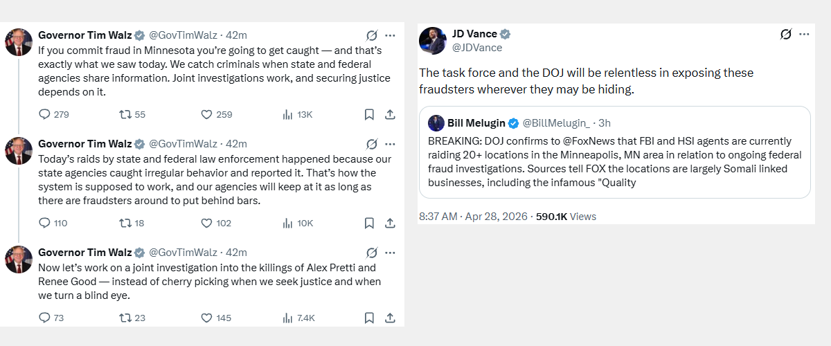 MORE: Via The New York Times, VERBATIM: “The operation was among the boldest moves since the White House launched a task force to combat fraud in social services programs last month, which Vice President JD Vance was appointed to lead. A law enforcement official said agents from the F.B.I. and the Department of Homeland Security had obtained 22 search warrants as part of the investigation. The official, who spoke on condition of anonymity to discuss an ongoing law enforcement matter, said the operation was unrelated to immigration enforcement.” READ: https://fluence-media.co/4ukbOyS