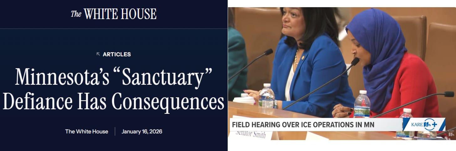 FROM THE WHITE HOUSE: “As President Donald J. Trump delivers on the promise that secured his overwhelming re-election, Minnesota’s ‘leaders’ have chosen defiance over partnership. Instead of working with the Trump Administration to uphold the law and protect public safety, the state’s Democrat politicians have repeatedly boasted of their so-called ‘sanctuary’ status, encouraged resistance, and smeared ICE officers. This toxic combination of ‘sanctuary’ policies and anti-ICE rhetoric has created a climate of hostility that endangers federal officers and incites violence. Make no mistake: the responsibility for the enhanced enforcement operations in Minnesota — and the tension and violence — lies squarely with these officials who refuse to partner with the Trump Administration and instead put their Radical Left agenda over public safety and the rule of law.” READ: https://fluence-media.co/4b42wR1