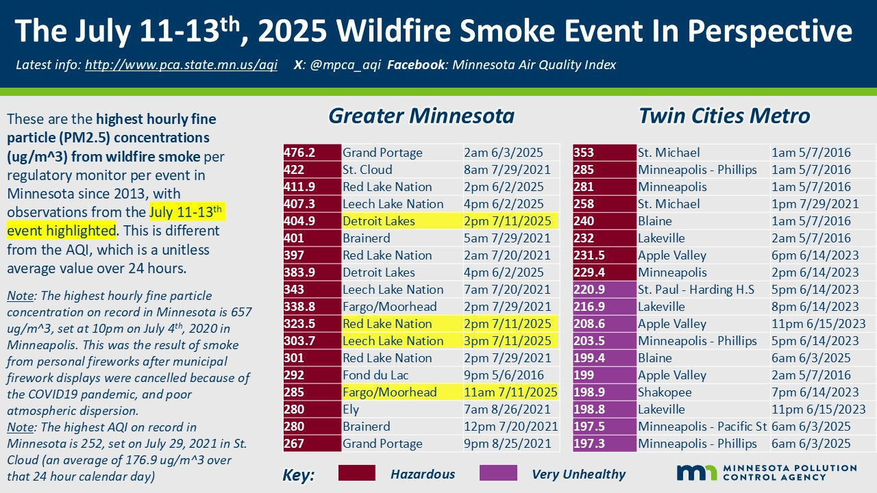 SMOKE: Via Bring Me The News, VERBATIM: “The smoke from Canadian wildfires produced some of the worst fine particle pollution on record in Minnesota over the weekend. The Minnesota Pollution Control Agency released the top hourly fine particle readings from the air quality alert that ran from Friday to Sunday, with the worst reading reaching 404.9 in Detroit Lakes.” READ: https://fluence-media.co/4o8pYRp