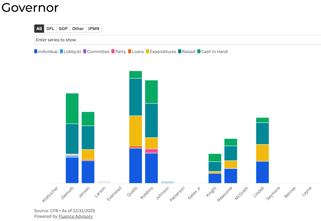 GOV RACE: Via release from the Robbins campaign, VERBATIM: “Kristin Robbins, candidate for governor and Chair of the Minnesota Fraud Prevention Committee, raised $565,000 since entering the race on August 20th. She entered 2026 with $374K in the bank.”