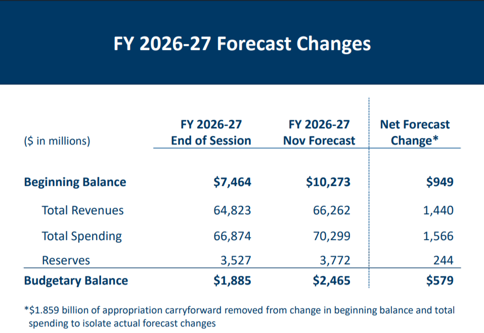 DETAILS: Via MMB, VERBATIM: “A better-than-expected fiscal year close and higher near-term revenue collections, partially offset by increased spending estimates, result in a projected surplus of $2.465 billion in the current biennium. Higher health care costs and slow economic growth drive an increased structural imbalance in the FY 2028-29 planning estimates where the balance is now projected to be negative $2.960 billion. Total general fund reserves remain strong and at their statutory target of $3.771 billion.” SEE: https://fluence-media.co/48RSYXG