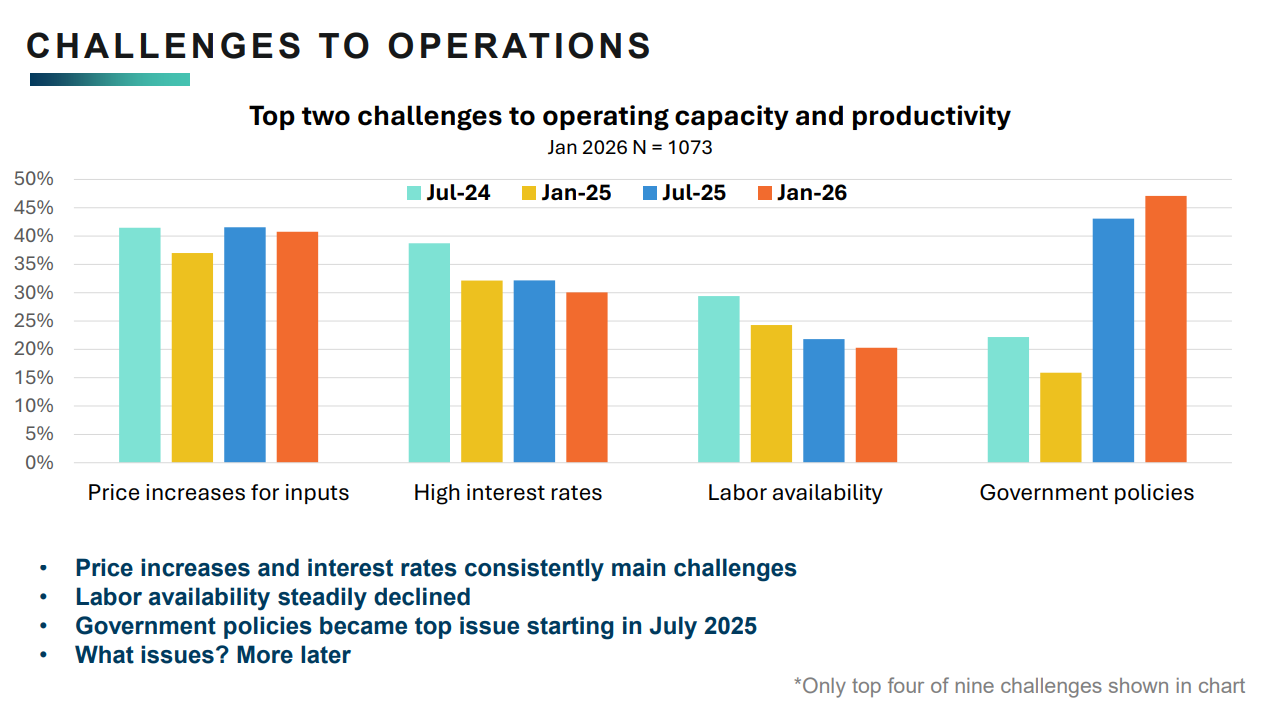 Tariffs continued to be a major government policy cited, though uncertainty lessened. Respondents alco mentioned immigration enforcement and Minnesota’s taxes and paid leave.