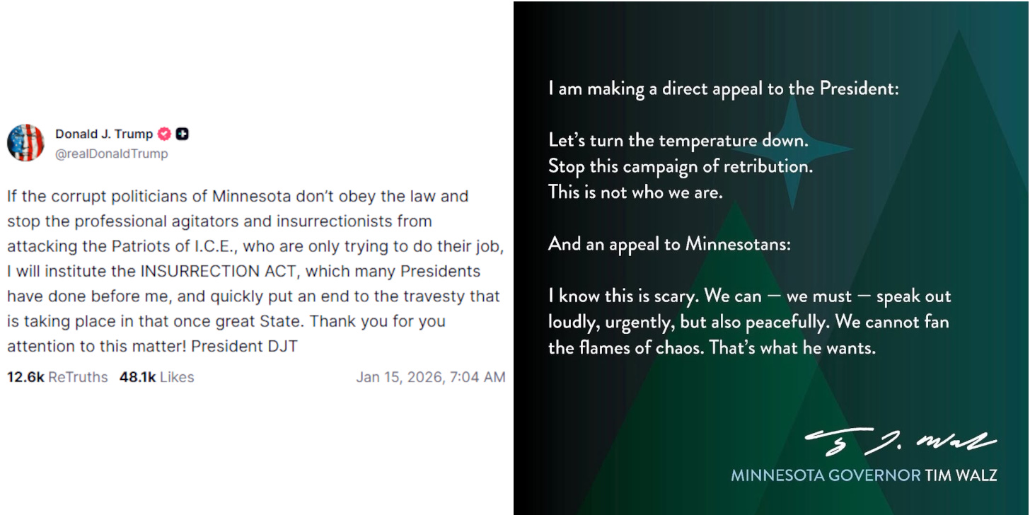 WALZ: From Governor Tim Walz via Instagram, appeals to both the President and Minnesotans to “turn the temperature down.” SEE: https://fluence-media.co/4qUi8es