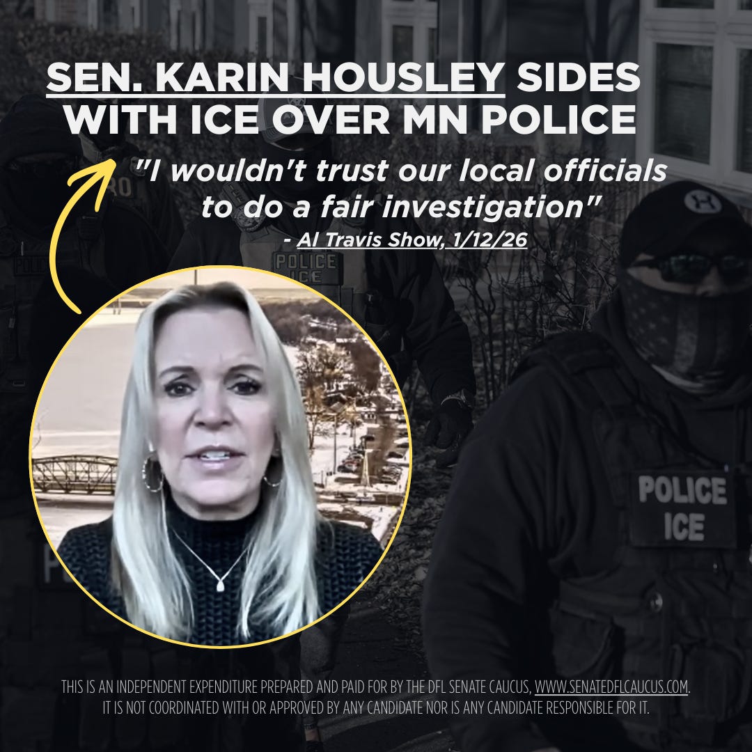 NEW AD: Via Senate DFL Caucus, VERBATIM: “Today, the Minnesota Senate DFL announced a new digital ad that began running on Monday against State Senator Karin Housley for her recent remarks that local law enforcement cannot be trusted to do a fair investigation of the killing of Renée Good.”