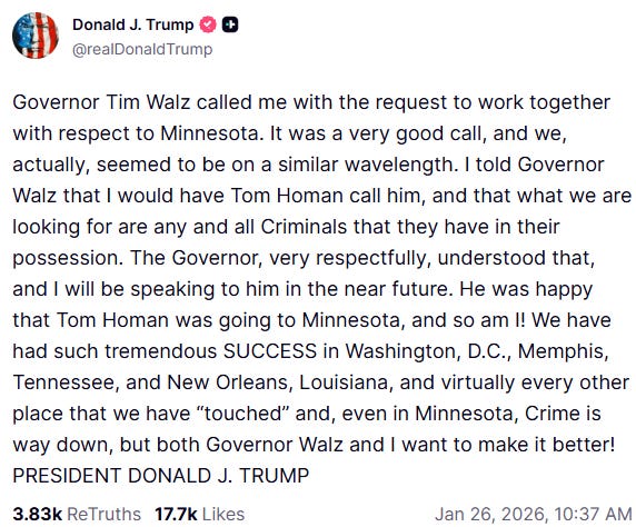 MORE: Pres. Donald Trump initially defended ICE this weekend and accused Minnesota officials of “inciting insurrection” on Truth Social, but he later adopted a softer tone in an interview with the Wall Street Journal. VERBATIM: “President Trump declined to say whether the federal officer who fatally shot a man in Minnesota this weekend had acted appropriately and said the administration was reviewing the incident.” TRUMP: “We’re looking, we’re reviewing everything and will come out with a determination. … At some point we will leave [Minnesota].” WSJ: https://fluence-media.co/3LYGlkW POST: https://fluence-media.co/4aeMGCc