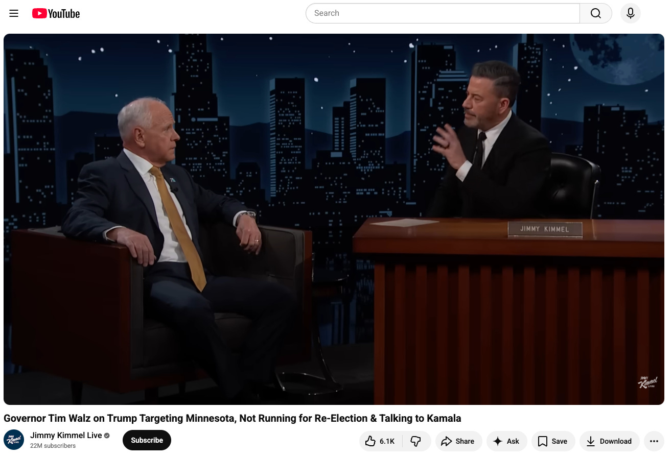 Last night while Minnesota was watching the Wild game, Gov. Tim Walz on The Jimmy Kimmel show he called the No Kings rally the greatest day of his life after his marriage…and suggested there may be a ghost in the Governor’s residence. VERBATIM: “I think he (Trump) hates Minnesota we take care of our people and we invest our people, we invest in people, we feed our people.. Well, I want to help elect people who are out there, good people. I was 40 and never went to a political meeting at all. Never did anything. Minnesota happened to have the infrastructure to do this… I know I can go find people who are better than the clowns and fools we have doing this right now and help them…”. WATCH: https://fluence-media.co/48CwI3R