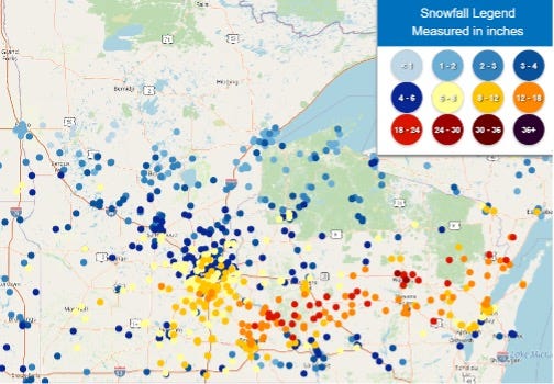 Southeast Minnesota and points east got hit the hardest. Weston, Wisconsin, near Wausau, got 24.5 inches of snow in 24 hours.