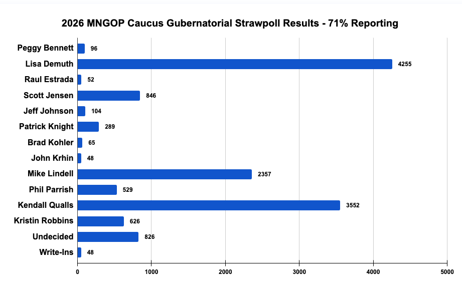 CAUCUSES: Speaker Lisa Demuth wins the MN Republican caucus and businessman Kendall Qualls finishes second, while MyPillow’s Mike Lindell finished third. No other candidate received over 1,000 votes. Those results include 71 percent of precincts reporting. Republican turn out will be somewhere under 15,000 while DFL turnout was said to be 30,000 by the party.
