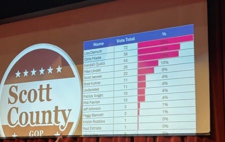 Last night in Scott County, another GOP straw poll for Governor, Speaker Lisa Demuth wins, Chris Madel second, and Kendall Qualls third, Mike Lindell fourth.