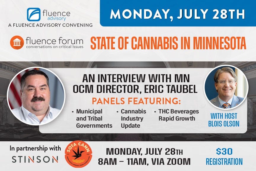 CANNABIS: Fluence Advisory is hosting a virtual forum featuring an interview with Minnesota Office of Cannabis Management Director Eric Taubel and other industry experts on Monday, July 28th. The event is in partnership with Stinson and Sota Cann.