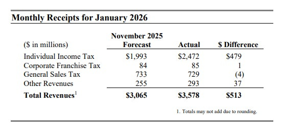 REVENUE: The state government’s income was over $500 million above expectations last month. Via MMB advisory, VERBATIM: “Net general fund revenues totaled $3.578 billion in January, $513 million (16.7 percent) more than forecast. Net receipts from individual income tax, corporate franchise tax, and other revenues were above forecast. Net receipts from general sales and use taxes were slightly below forecast. For fiscal year 2026, year-to-date receipts are now $19.441 billion, $558 million (3.1 percent) more than forecast.” READ: https://fluence-media.co/3ZQP0tn