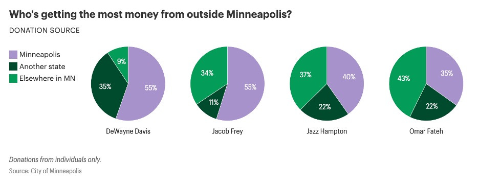 MPLS MAYOR: via Star Tribune, VERBATIM: “Mayor Jacob Frey, aiming for his third term leading the city, is outraising his opponents and bringing in money from more individual donors across the city than any other candidate, campaign finance data show, but his major competitors have areas of donor strength. At least 552 people living in Minneapolis donated to Frey’s campaign between August 2024 and the end of July, the most recent disclosure deadline. That’s over 200 more donors than his three opponents combined. … [Omar] Fateh has 156 donors across Minneapolis. The average donation to his campaign is $186, notably less than the other major candidates in the race. … While more than half of Fateh’s fundraising comes from outside Minneapolis, most of that is from other parts of Minnesota.” READ: http://fluence-media.co/3VYpfFy
