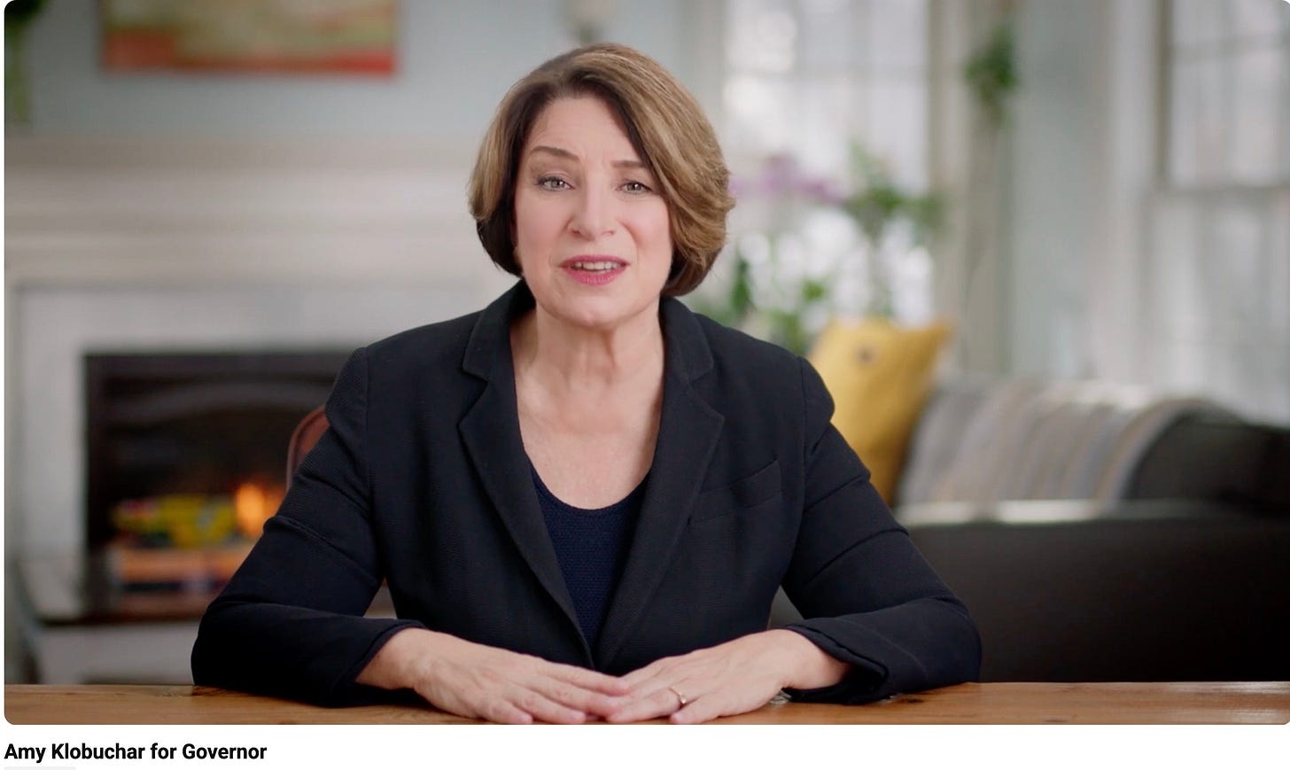 KLOBUCHAR: Sen. Amy Klobuchar announces her Gubernatorial campaign this morning. SCRIPT: “Minnesota, we’ve been through a lot. [...] In these moments of enormous difficulty, we find strength in our Minnesota values of hard work, freedom, and simple decency and good will. These times call for leaders who can stand up and not be rubber stamps of this Administration, but who are also willing to find common ground and fix things in our state… believe we must stand up for what’s right and fix what’s wrong. That’s why today, I am announcing my candidacy for Governor of the state of Minnesota….I like my job in the Senate. But I love our state more than any job. I love the people of Minnesota.”