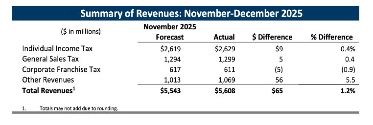 BUDGET: via MMB monthly memo, VERBATIM: “Net general fund receipts for November and December 2025 now estimated to total $5.6 billion, $65 million (1.2%) more than forecast in November. Both net individual tax and sales tax receipts were slightly above the forecast, while net corporate franchise tax receipts were slightly below. Other revenues were above forecast.”