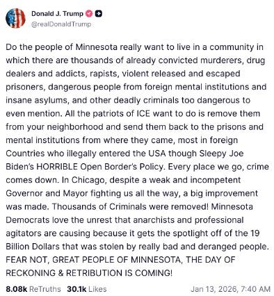 MORE: via AP News, VERBATIM: “President Donald Trump said Tuesday that starting Feb. 1 he will deny federal funding to any states that are home to [cities] resisting his administration’s immigration policies, expanding on previous threats to cut off resources to the so-called sanctuary cities themselves. … Trump was asked by reporters what kind of funding would be affected on Feb 1.” TRUMP: “You’ll see. It’ll be significant. Minnesota is going to have to take care of itself for a little while.” READ: https://fluence-media.co/3ZdoQ3m
