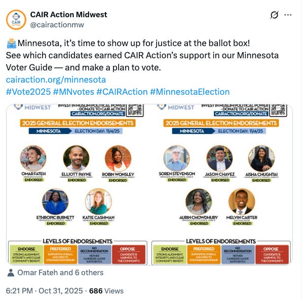 CAIRMN: In ads CAIR Action Midwest calls out its endorsements for Minneapolis races to “Invest in Muslim Political Power”. While the post doesn’t only highlight Muslim candidates, it’s a message that if pushed by a Christian or Jewish organization would undoubtedly draw outrage from the far left and CAIR. In fact, progressive social media commentators from Minnesota have called out candidates in the Anoka-Hennepin race as “White Christian Nationals” as a criticism. TWEET: https://fluence-media.co/3JDjL05