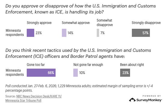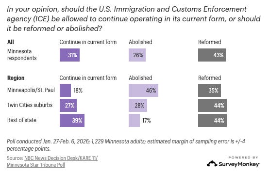 POLL: via Star Tribune, VERBATIM: “About two-thirds of Minnesotans view U.S. Immigration and Customs Enforcement negatively and believe the tactics of federal agents have gone too far, according to the NBC News Decision Desk/KARE 11/Minnesota Star Tribune Poll powered by SurveyMonkey… An overwhelming majority of Minnesotans want local police to cooperate with immigration authorities to deport people in some or all cases… ICE’s approval is lowest in Minneapolis and St. Paul, a hotbed of DFL support, but 69% of suburban residents also disapprove of how ICE is handling its job.” READ: https://fluence-media.co/3OjPmpA