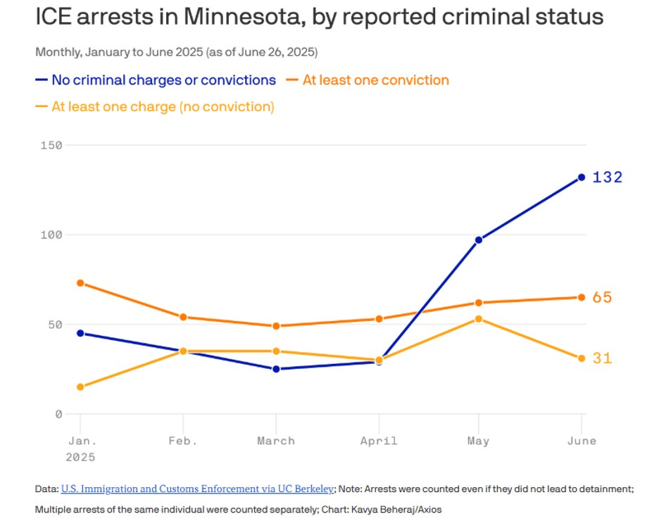 ICE: via Axios Twin Cities, VERBATIM: “Immigration and Customs Enforcement (ICE) arrests of people without criminal charges or convictions in Minnesota surged in June, newly obtained data shows. More than half of ICE's arrests in Minnesota (58%) involved people without criminal charges or convictions in June, up from roughly one-quarter of arrests in April.” READ: http://fluence-media.co/4f13o8O