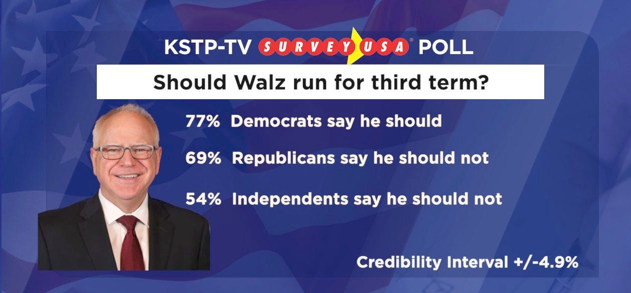 POLL: A KSTP poll of voters in Minnesota finds that Gov. Tim Walz has a net positive approval rating of +19% — 58% approve, 39% disapprove, 3% unsure. However, voters are split on whether Walz should run for a third term as governor next year, with “yes” and “no” tied at 43% while 13% are unsure. Nearly 1 in 4 Democrats don’t support a third term, and a majority of Independents (54%) say Walz should not run again. RESULTS: https://fluence-media.co/3T8GySV
