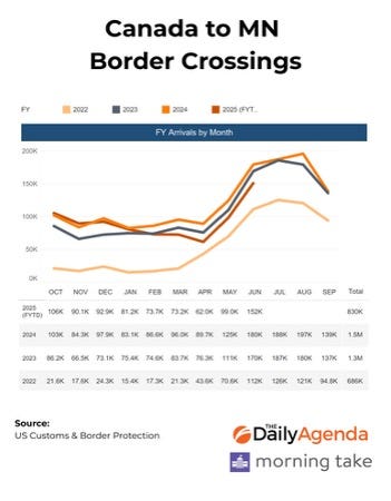 CANADA: A Fluence analysis of the latest Customs & Border Protection data shows that border crossings from Canada to Minnesota this fiscal year are currently below FY2023 and FY2024 levels, but above FY2022 numbers during the tail end of the COVID-19 pandemic. Notably, border crossings in FY2025 roughly matched FY2024 rates until the inauguration of Pres. Donald Trump — after that, rates began to decline.