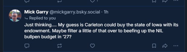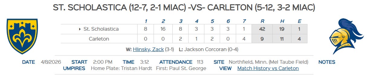 ANOTHER BAD, BAD BEATDOWN: Last week’s Sports take posted an MIAC line score that featured a 14-run pitching meltdown by St. Olaf that allowed Macalester to rally for a 17-10 win. There was quite an encore in Northfield on Wednesday afternoon. Four Carleton pitchers combined to give up 32 runs in the first three innings in a 42-9 loss to St. Scholastica. (For the record, Carleton led the second game of the doubleheader 9-3 when play was suspended in the ninth inning.)