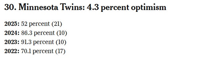 CAN IT GET WORSE II? Do I need to do more than show you this section from The Athletic’s fifth-annual Hope-O-Meter of MLB fans. The Twins came in 30th among 30 teams — and with a stunning drop in optimism from a majority of their fans in 2025 (and before) to 1 in 25 being optimistic about this season. It’s hard to become that unpopular that quickly without committing fraud, right?