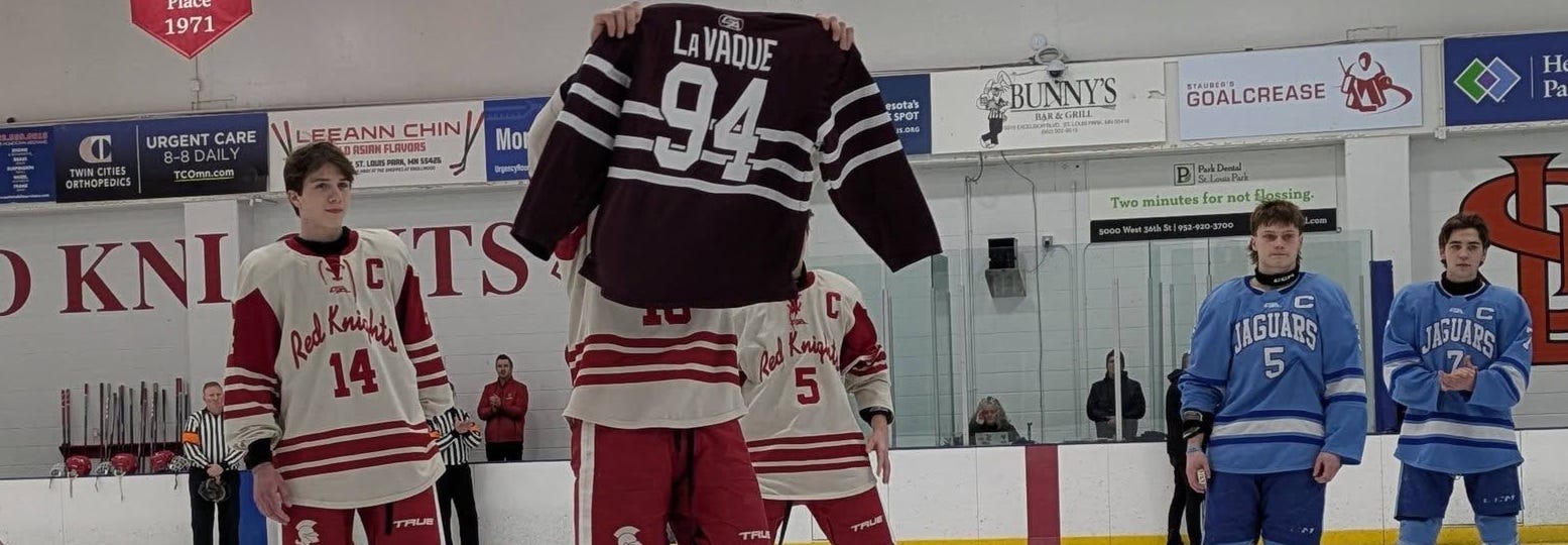 GOFUNDME FOR PREP HOCKEY WRITER: Former Star Tribune reporter David La Vaque was saluted at Tuesday night’s boys’ game between Benilde-St. Margaret’s and Bloomington Jefferson. La Vaque, 50, has been diagnosed with leukodystrophy, a disorder that impacts the central nervous system, and is currently living in a Twin Cities assisted living facility, where Benilde coach Ken Pauly is a frequent visitor. As part of a pregame ceremony, La Vaque was presented with a jersey from his alma mater, St. Paul Johnson, where he graduated in 1994. A GoFundMe to help with his expenses has been established here.