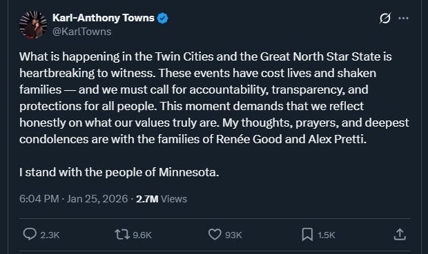 ELSEWHERE: Athletes and those connected to them made an assortment of statements, ranging from ICE OUT shirts worn by one Minnesota college basketball team and the Minnesota Slam Squad, which performed at Sunday’s Wolves-Golden State game, to social media posts. Here are a few: