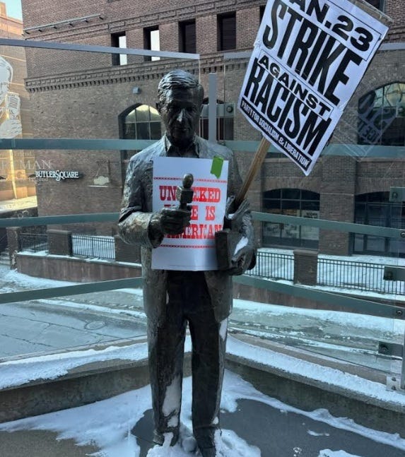 HOW IT STARTED: Via John Shipley at Pioneer Press. VERBATIM: “Before tens of thousands of protesters marched in Minneapolis on Friday to demand Immigration and Customs Enforcement agents leave Minnesota, they were mocked by the voice of the Minnesota Vikings. The protestors marched from Commons Park at the edge of downtown to a rally at Target Center in temperatures that hovered around 10 degrees below zero. While discussing the cold with former Vikings linebacker Chad Greenway, Allen said, ‘In conditions like this, do paid protesters get hazard pay? Those are the things that I’ve been thinking about this morning.’ The moment was saved by the web site awfulannouncing.com and can be heard here. . . . The remark, which pushes a baseless narrative that protesters are paid by left-wing groups, is commonly made to undermine the importance of social protest.” FULL STORY AND FOLLOW-UP: https://fluence-media.co/pa0129
